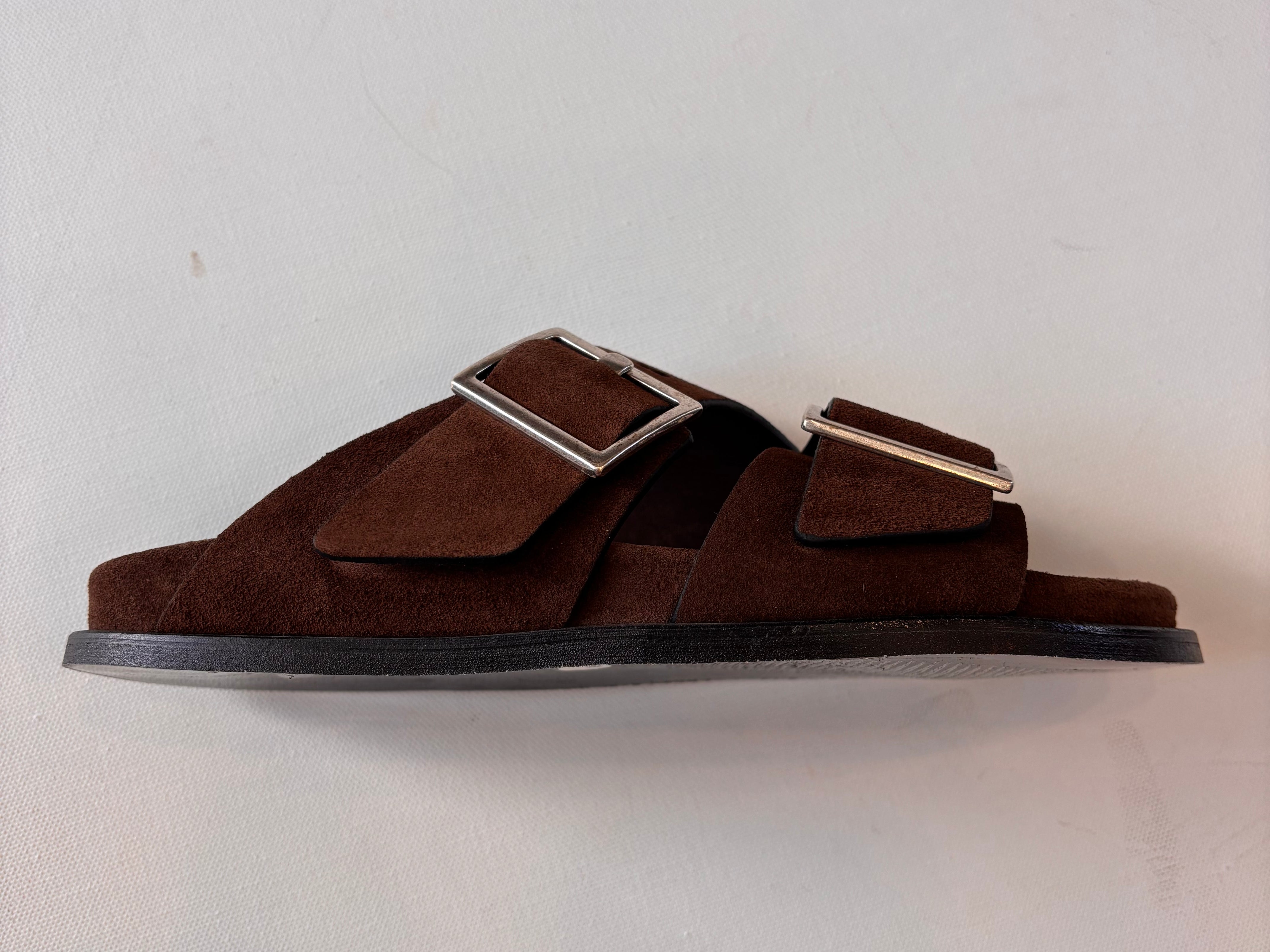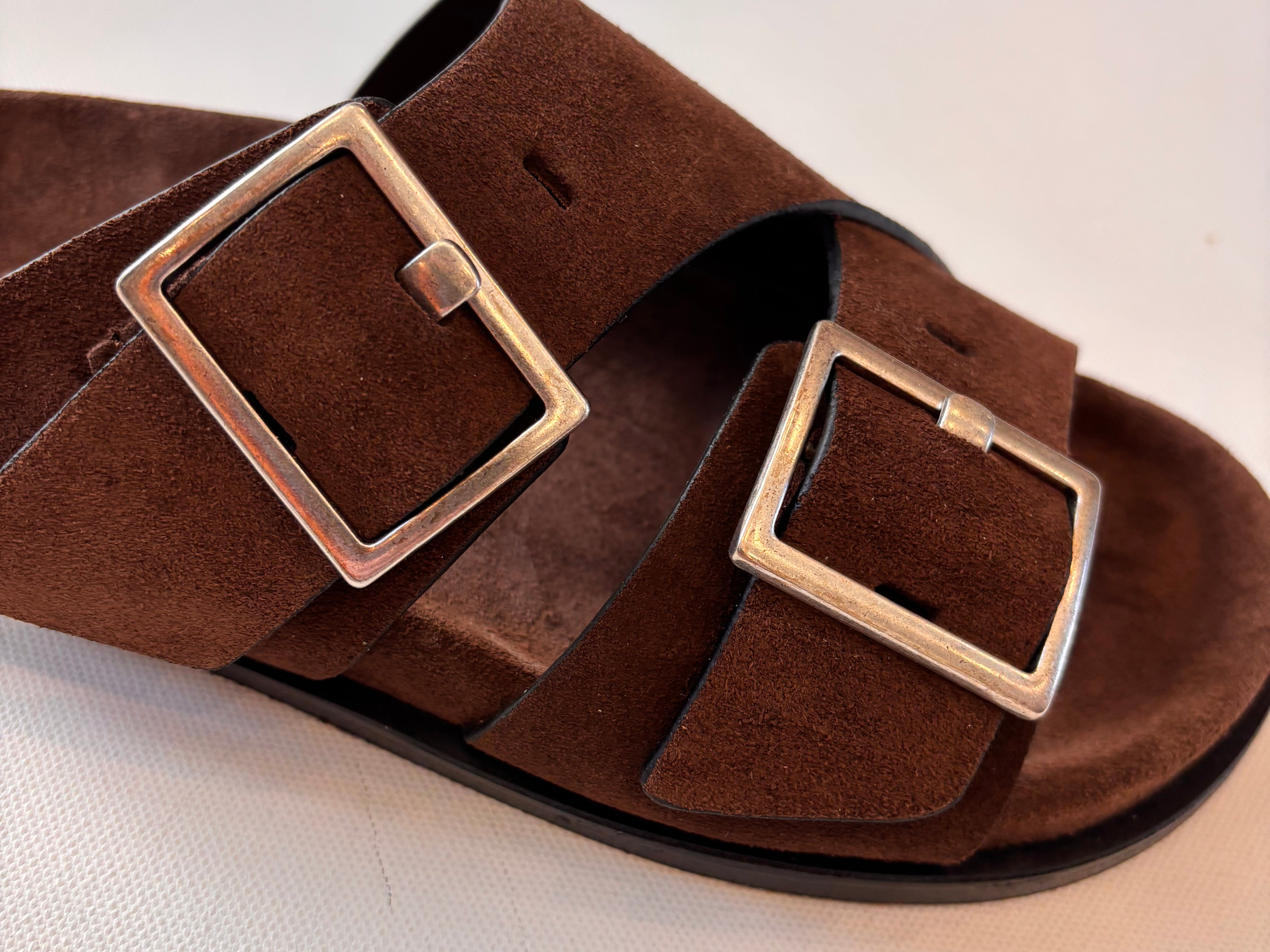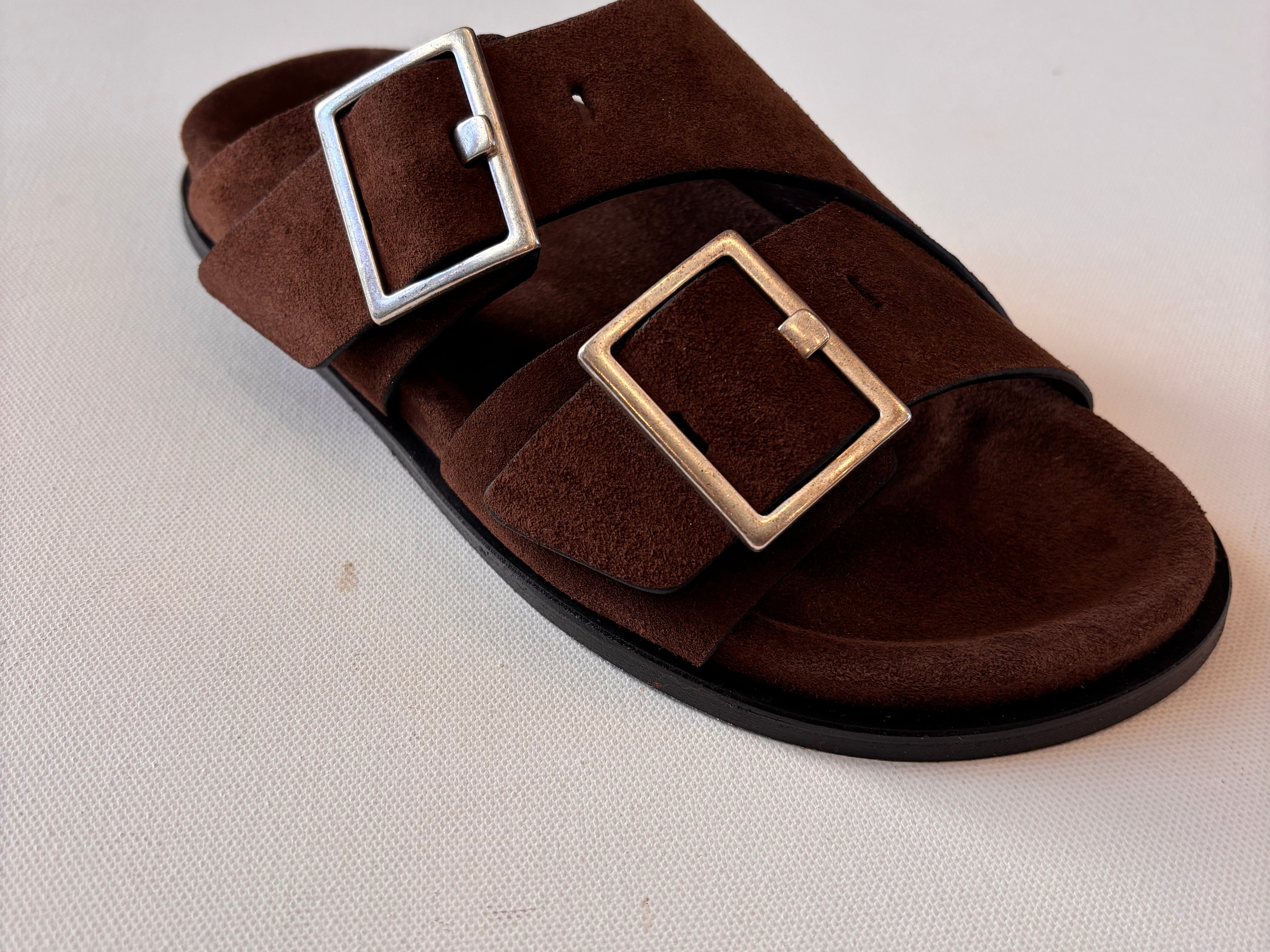 - Composition: Upper: 100% Cow Suede, Lining: 100% Goat Leather, Insole: 100% Cow Suede, Outsole: 100% Cuerolite, Hardware : 100% Zamak Ecologic Finishing