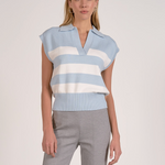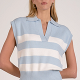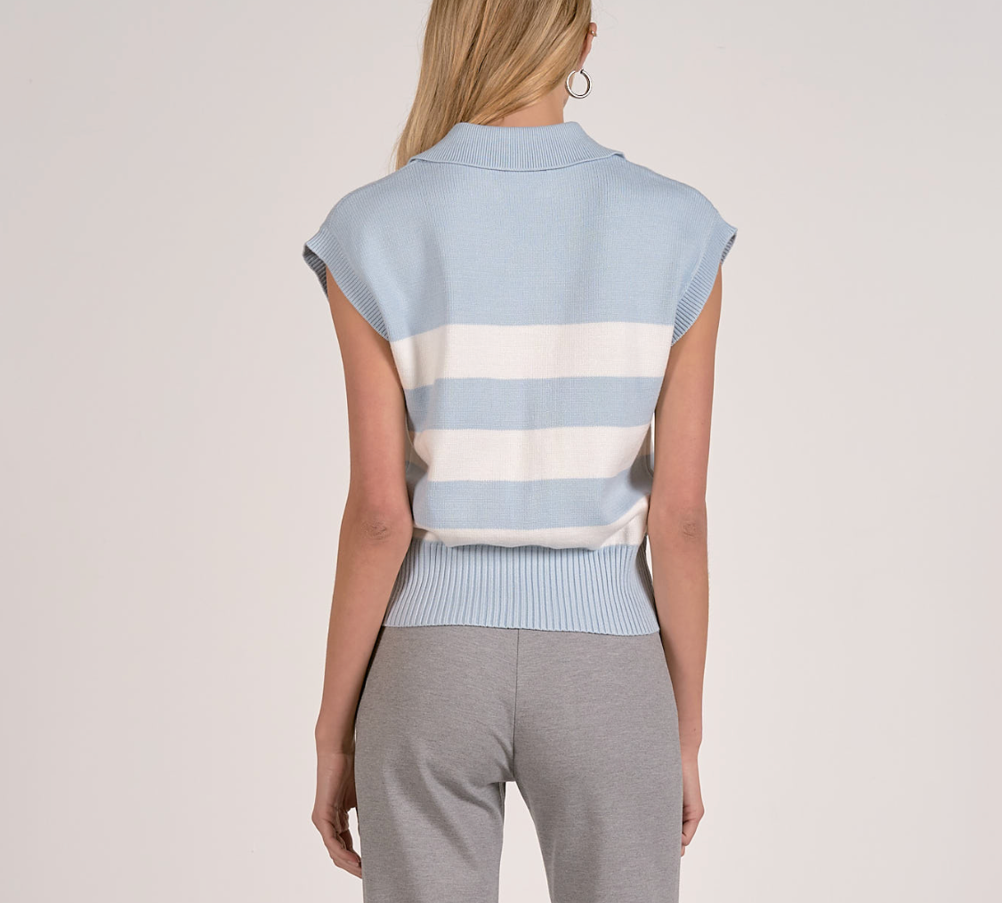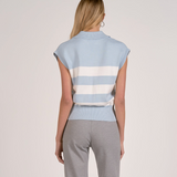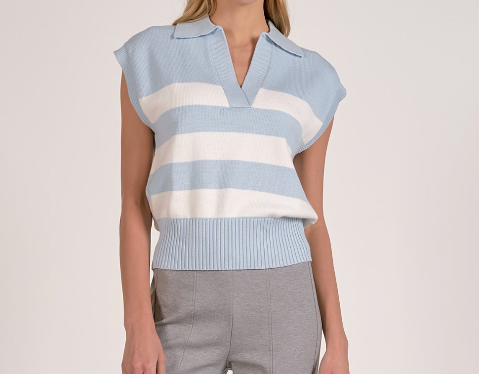 Elevate your casual wardrobe with the Barbara Stripe Top, a timeless piece that effortlessly transitions from season to season. This sleeveless sweater features a classic blue and white striped pattern that pairs beautifully with everything from denim to tailored trousers. The structured collar adds polish and sophistication, while the lightweight knit keeps you comfortable all day long. Perfect for layering or wearing solo, this versatile top is an essential addition to any style-conscious closet.