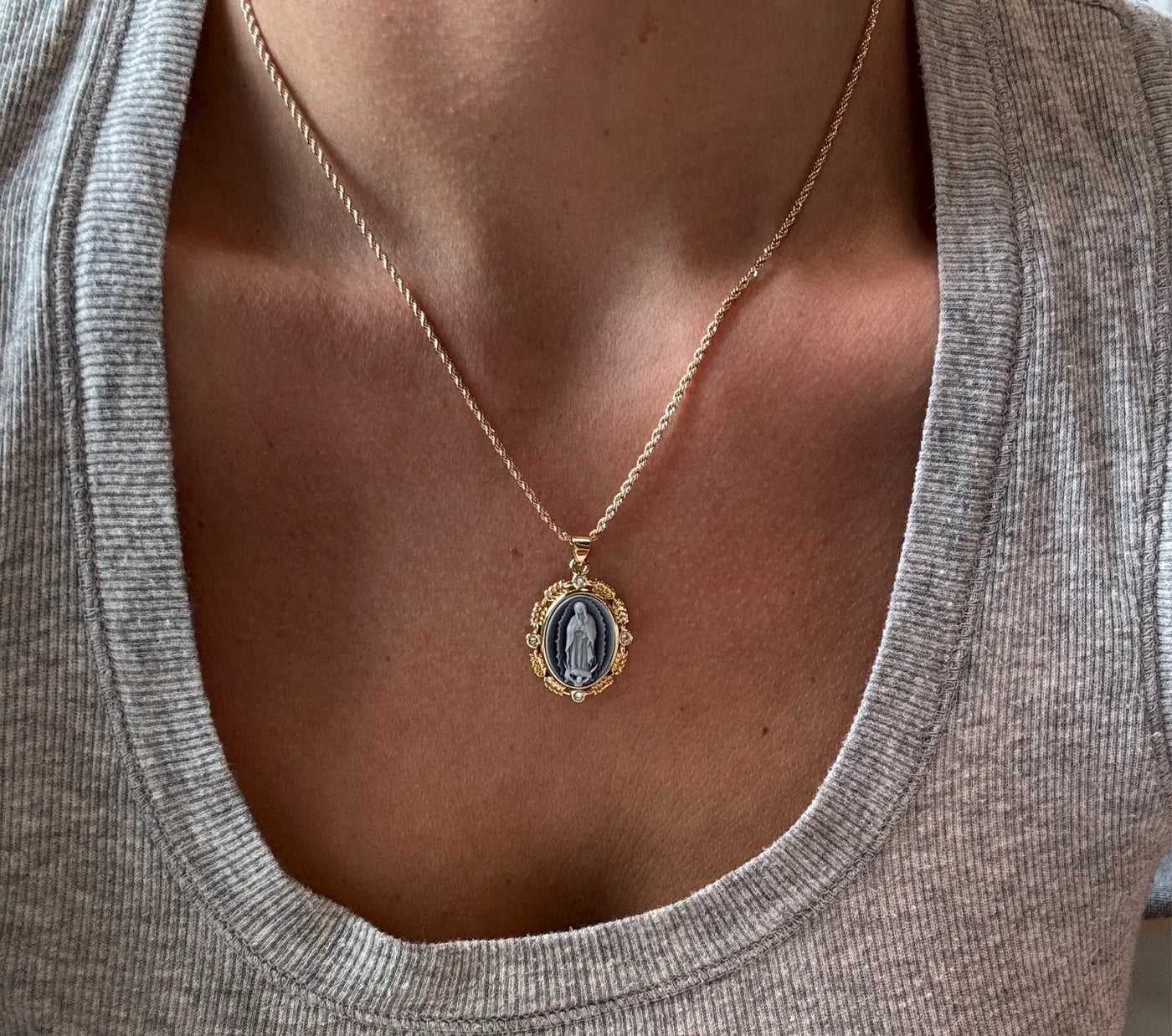 Carry faith and elegance close to your heart with this Virgin Mary cameo pendant necklace, framed in a detailed gold setting with sparkling CZ accents. The classic rope chain adds timeless style, while the intricately carved cameo brings a vintage-inspired touch. A meaningful statement piece, this necklace is perfect for layering or wearing solo as a daily symbol of devotion and protection.