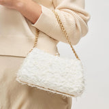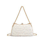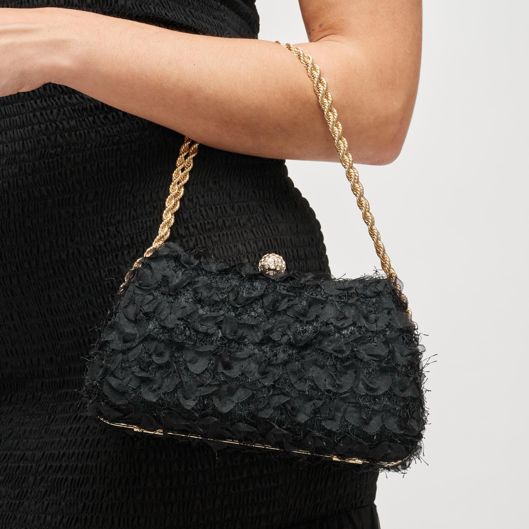 - Exterior Details: Structured Shape, Gold Hardware, Detachable Chain Strap, Textured Fabric