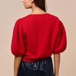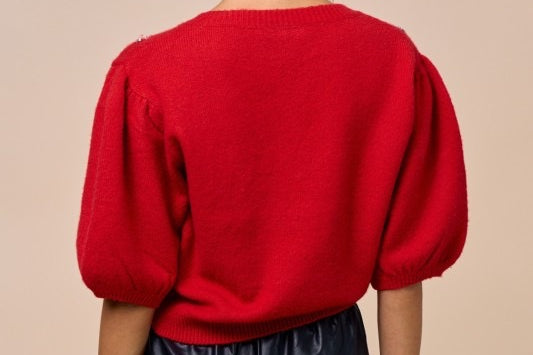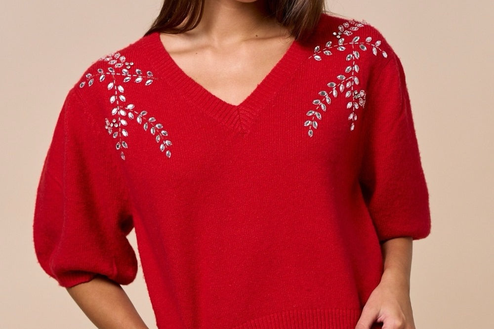 Celebrate cozy style with a nature-inspired twist in this charming sweater featuring embroidered leaf detailing and elegant peplum sleeves. The soft knit texture and feminine silhouette make it perfect for transitional weather and effortlessly chic layering.