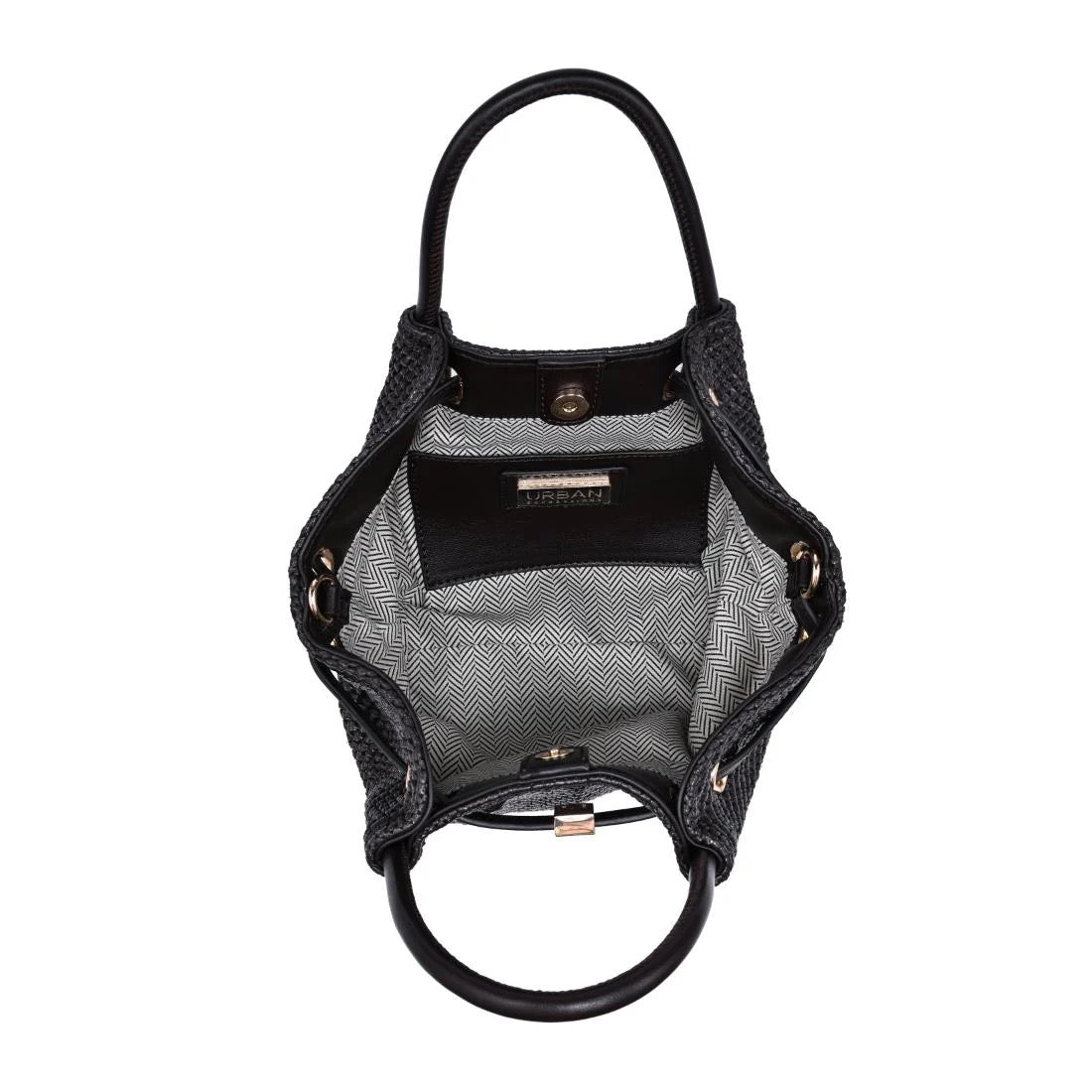 - Exterior Details: woven textured body with leather-wrapped handles and an adjustable strap that clips on via metal hardware, while edge reinforcement distributes tension when drawn