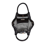 - Interior Details: single leather-trimmed slip pocket with label patch sits against a herringbone-lined interior, main compartment for quick visibility and access to essentials
