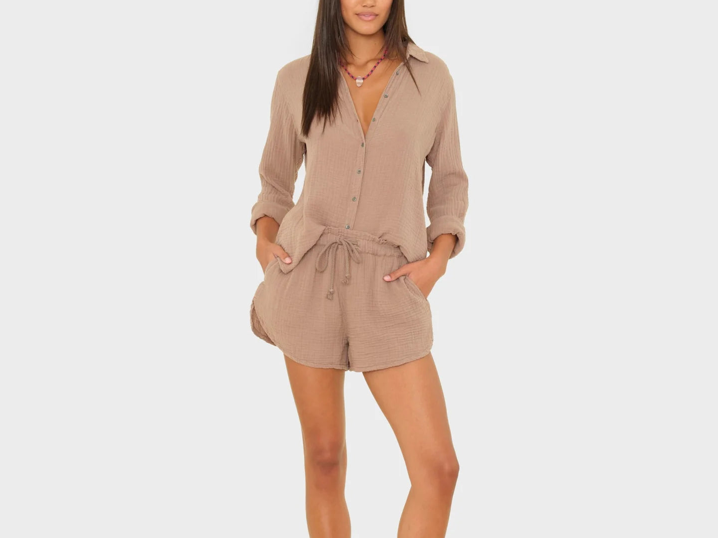 Short and Sweet. Starla is made in our washed double faced cotton gauze for a soft, gently crinkled feel. Starla is a Dolphin short with an elasticized drawstring waist and side seam pockets.